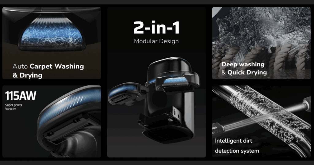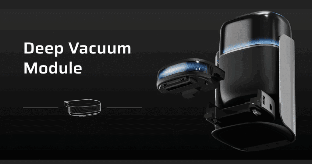 It combines several systems into one platform, with separate modules for vacuuming and carpet cleaning, supported by an automated base station.